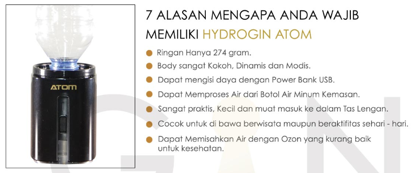 Produk Hydrogin Atom adalah karya terbaik PT GIN Makmur Perkasa ( GIN ) yang merupakan perusahaan bergerak di bidang kesehatan dan kesejahteraan yang menjadi pemenang berbagai penghargaan kesehatan teknologi untuk kesejahteraan umat manusia.